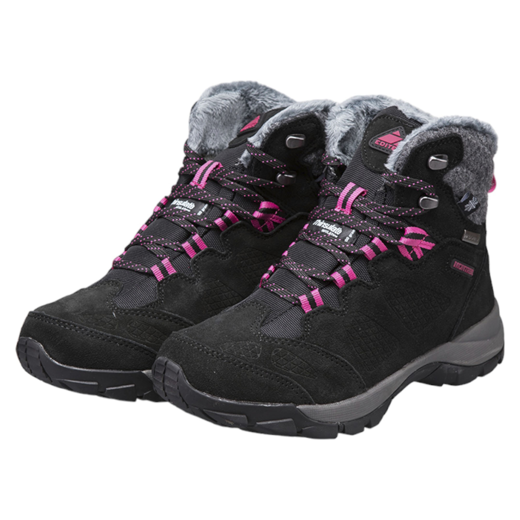 Сочетая стильный контрастный дизайн вместе с качественной сборкой и материалами ботинки Editex Montreal станут отличным выбором для любителей активного отдыха или просто для обычных пеших прогулок по городу. Внешний слой ботинок выполнен на основе износостойкой замши, что в сочетании с водоотталкивающей обработкой Durable Water Repellent (DWR) позволяет ботинкам выдерживать попадание влаги и мокрого снега при ходьбе. Для дополнительной защиты от попадания влаги изделие оборудовано мембранной, произведённой по технологии Waterproof Windproof Breathable (WWB), благодаря микроскопическим порам обеспечивается вентиляция внутреннего пространства ботинок, защищая ноги от попадания влаги извне с сохранение комфортного микроклимата. Современный утеплитель Thinsulate за счёт полиэфирных микроволокон эффективно удерживает тепло, термоизолируя ноги владельца и позволяет с комфортом носить обувь в широком температурном интервале. Валяная шерсть на голенище ботинок придаёт не только особый вид изделию, но также защищает голень от холода и ветра. Специальная колодка позволила создать максимально удобную обувь для женской ноги, что в сочетании с антимикробными съёмными стельками OrthoLite, защищающие от неприятного запаха и обеспечивающие дополнительную вентиляцию стопы, позволяет ощущать комфорт даже при суровых погодных условиях. Промежуточная подошва EVA эффективно распределяет нагрузку при ходьбе, делая пешую прогулку мягкой и комфортной. Подошва Ultra Slip Protection (USP) обладает высокой гибкостью и износостойкостью благодаря прочной резине с развитым рисунком протектора, что обеспечивает надёжное сцепление с рельефом. Прочная шнуровка с крепкими петлями создаёт надёжную посадку на ноге. Крепкие материалы с прошивкой из двойной строчки позволяют ботинкам выдерживать длительное ношение и множественную чистку с сохранением свойств и цвета. Контрастный дизайн чёрного цветового исполнения с яркими розовыми петлями позволяет обуви сочетаться как со спортивной, так и с повседневной одеждой.Характеристики:
